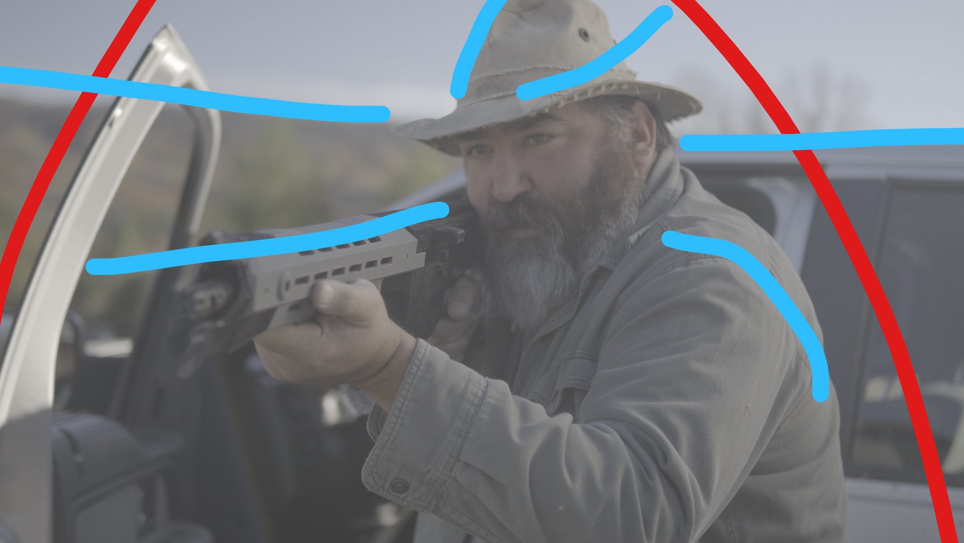 The goal of any frame is to keep the eye moving in a continuous cycle, always leading the eye back to the point of interest. Here the point of interest is the face of the subject and his rifle. The truck and scene in the background are secondary elements, but still important to the overall frame and story.
